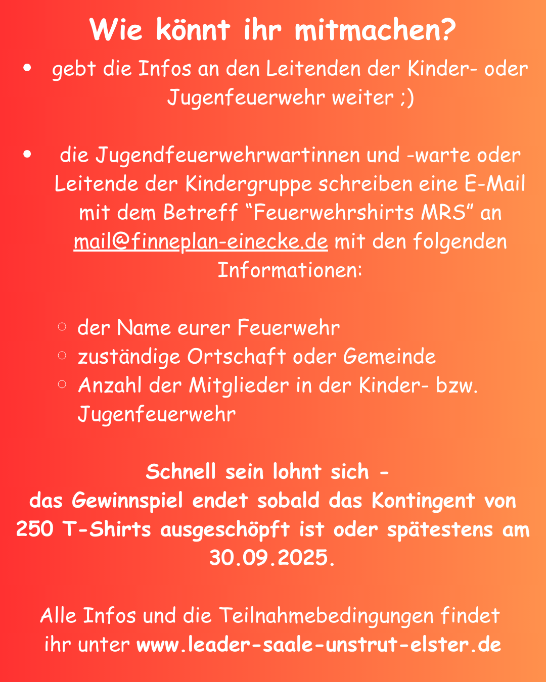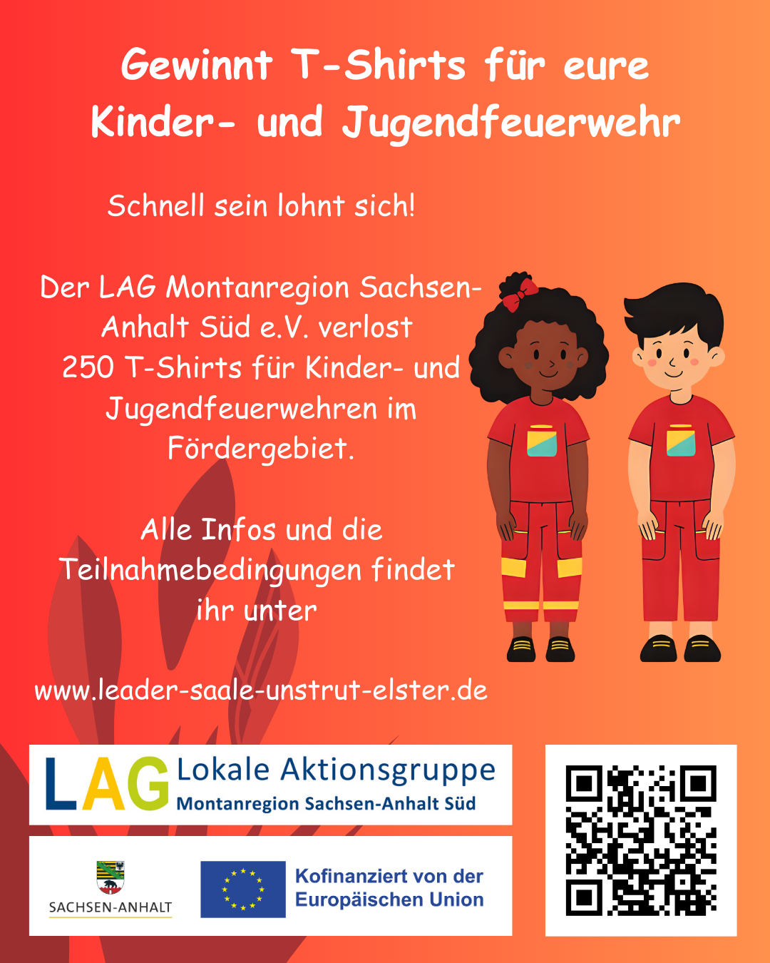Die LAG Montanregion Sachsen-Anhalt Süd verlost 250 T-Shirts für Kinder- und Jugendfeuerwehren in der Region. Damit möchten wir die Vereine unterstützen und das Zusammengehörigkeitsgefühl stärken.